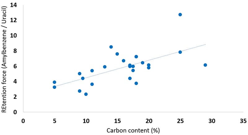 As an example, we used 26 different types of C18 columns from different manufacturers and brands, and summarized the relationship between carbon content and retention in Fig. 1 below. Fig. 1 shows that there is a positive correlation between carbon content and retention. (Calculations of particle parameters such as carbon content and surface area vary from manufacturer to manufacturer.)