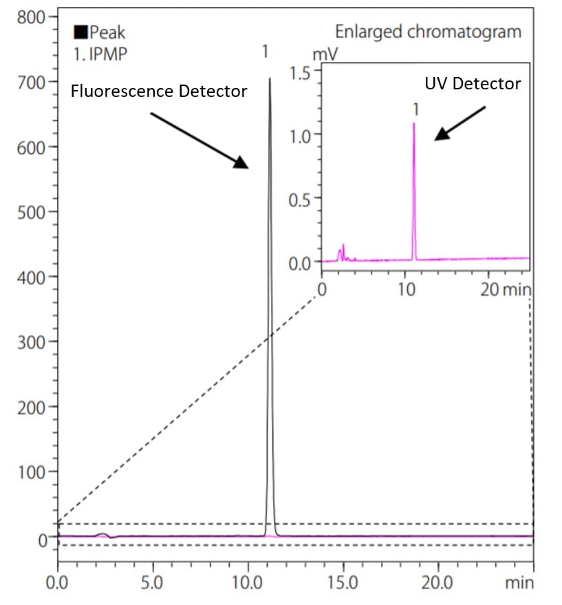 In the case of this analysis, a 2 mg/L IPMP standard solution was analyzed. The concentration corresponds to the content of 0.1% that is equivalent to the lowest allowable content in real sample specified in the Japan’s Ministry of Health, Labour and Welfare (MHLW) assignment. In comparison with the absorbance detector, IPMP was detected with approximately 20 times higher sensitivity by the fluorescence detector.
