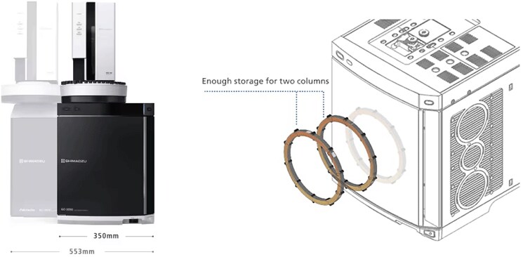 Additionally, despite its compact size, it can accommodate a standard capillary column and double productivity by simultaneously analyzing samples on two analytical lines. This system is the world’s narrowest system that can analyze two concurrent analyses.