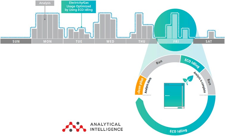 The ECO Idling function maintains GC’ s accurate analytical performance as usual during analysis, and automatically switches to an energy-saving status when not analyzing. It learns the analysis patterns, visualizes the amount of weekly analysis work, and can also propose an eco operation schedule to laboratory chemists.