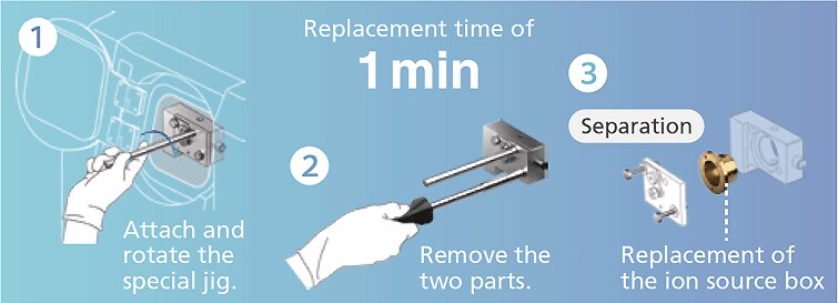 Ion Source Maintenance Takes Just One MinuteThe DuraEase ion source completely re-imagines the conventional ion source to enable more convenient maintenance. The ion source is disposable and no cleaning is required, so maintenance is finished in just one minute.