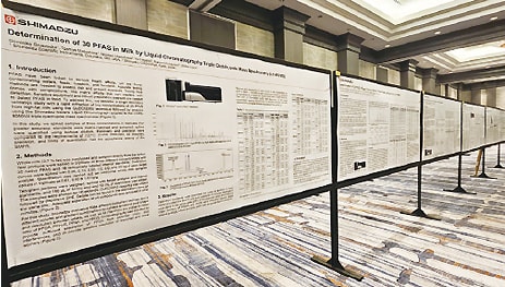 At poster sessions, Shimadzu presented research results on 25 topics. The poster sessions featured many examples of using LCMS and GCMS systems for PFAS analysis and provided knowledge about not only food but also food packaging. A wide variety of instruments, such as LC-MS, GC-MS, ICP-MS, HPLC, and FTIR systems, were used in presentations on a wide range of topics, such as nutrient components,aroma components, pesticides, PAHs, MOSH/MOAH components, and inorganic elements. Participants asked questions about factors to consider and detection sensitivity for analyzing food samples that contain a large number of contaminants. Shimadzu presentations can be viewed via the Shimadzu website.