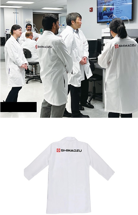 During the AOAC meeting schedule, many attendees participated in tours of the nearby SSI laboratory. The tours provided an opportunity for participants to freely discuss PFAS analysis with LC-MS and GC-MS engineers. Participants shared comments about struggling with contamination originating from working environments and with detecting trace concentrations. Given Shimadzu’s involvement in a variety of research on food samples, Shimadzu engineers provided information about how different matrices can affect analytical results. The fact that Shimadzu engineers in respective regions have been working together to study and share information about PFAS was also highly appreciated by participants. The PFAS logo themed laboratory coats worn during the tours were also very popular and offered as souvenirs.