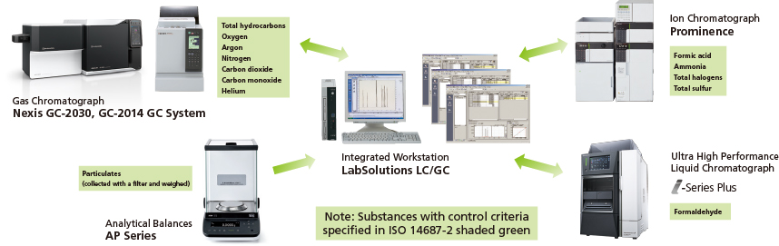 Strict purity standards (ISO 14687-2) are specified for hydrogen used in fuel cells. If the hydrogen contains carbon monoxide or sulfur components, it can break down the catalyst in the fuel cell. Shimadzu analytical instruments are useful for analysis involving in confirming compliance with the many quality control criteria specified in the standard for hydrogen fuel used in fuel cell vehicles (ISO 14687-2). Using LabSolutions LC/GC integrated workstation software enables the control and data analysis for multiple analytical instruments from a single workstation.