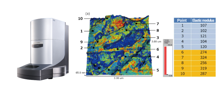 Cellulose nanofibers (CNFs) have gained attention as a sustainable plant-based carbon-neutral material that is very environmentally compatible. CNFs must be evaluated based on fiber length, fiber thickness, dispersion, and other parameters. Nano-3D mapping functionality of a scanning probe microscope (SPM) can be used to visualize the dispersion within a composite material by overlaying an elastic modulus image on an image of the 3D shape of the CNF composite material.
