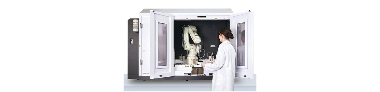 The MUP-3100 automates the time-consuming pretreatment process in the analysis of antibody glycans, which is required for the research and development and quality control of antibody pharmaceuticals. A 6-axis robot provides labor savings and increases efficiency with respect to processes that were conventionally performed manually. This enables not only continuous operations, but also eliminates procedural mistakes, ensures the safety of operators, and lessens the burden on them.