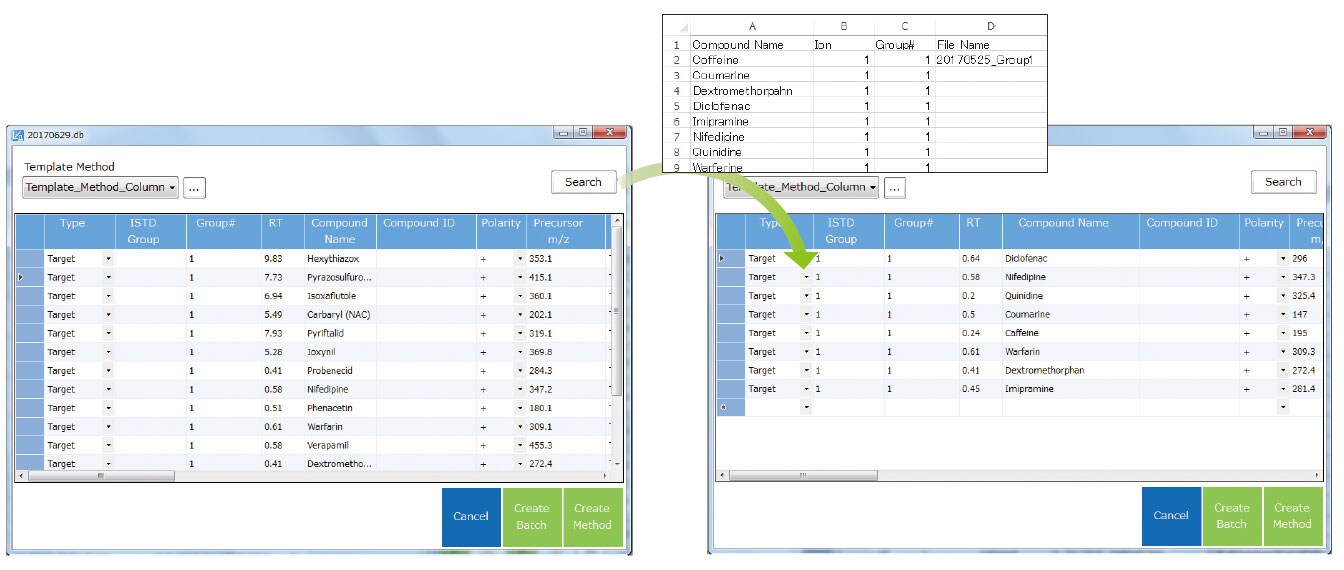 With LabSolutions Connect, the required information from MRM optimization results registered in the database can be accessed by loading in a text file, and then a method file used for analysis can be easily created. In addition, the settings for the batch file saved in a text file can be loaded, speeding up the process of batch file creation. The intuitive graphical UI reduces the burden on the user when configuring a real-time batch analysis..