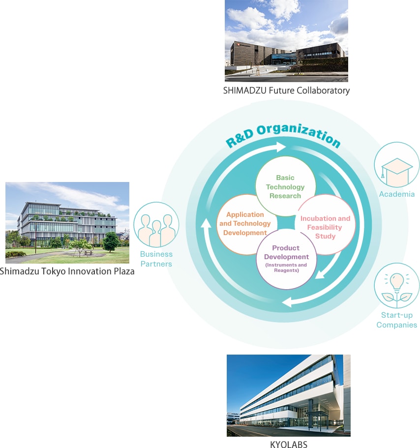 Con el objetivo de resolver desafíos sociales cada vez más complejos, Shimadzu ha establecido tres instalaciones como lugares para mejorar el conocimiento y promover comunicaciones rápidas para crear nuevo valor a través de la innovación. Trabajamos con socios externos para promover la co-creación y la colaboración en la investigación de tecnología fundamental en el SHIMADZU Future Collaboratory, el desarrollo de tecnología de aplicaciones en Shimadzu Tokyo Innovation Plaza y el desarrollo de productos en KYOLABS. Shimadzu también está trabajando en el desarrollo en el Shimadzu Nagasaki Collaboration Lab, que se centra en aprovechar las capacidades tecnológicas de la prefectura de Nagasaki.