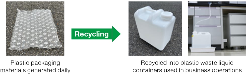 Desde el año fiscal 2022, para reducir el uso de polietileno, un tipo de plástico, hemos estado convirtiendo materiales de embalaje usados en pellets y mezclándolos con pellets vírgenes para producir contenedores de polietileno con un 30% de contenido reciclado, que se utilizan como contenedores de recolección de líquidos residuales en nuestra planta en la oficina central. La Universidad de Ryukoku también se ha unido a esta iniciativa de circulación de recursos desde el año fiscal 2023. Firmamos un acuerdo de asociación integral con la Universidad para promover una sociedad orientada al reciclaje y estamos trabajando juntos en la transición a una economía circular a través de actividades como la organización conjunta de seminarios.