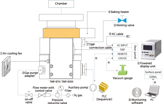 | Vacuum Gauge-Linked TMP Start/Stop | A function that starts the auxiliary pump and activates the turbo molecular pump after the pressure reaches the set pressure. Additionally, a function that stops the turbo molecular pump if the pressure exceeds the set pressure. |