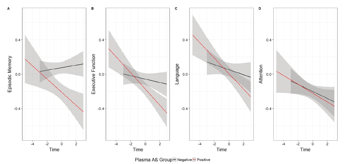 Fig. 1. Plasma Aβ+ is associated with faster decline in (A) episodic memory, and (B) executive function, but not (C) language or (D) attention