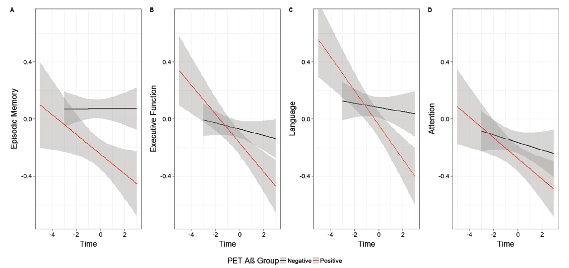 Fig. 2. PET Aβ+ is associated with faster decline in (A) episodic memory, (B) executive function, and (C) language, but not (D) attention