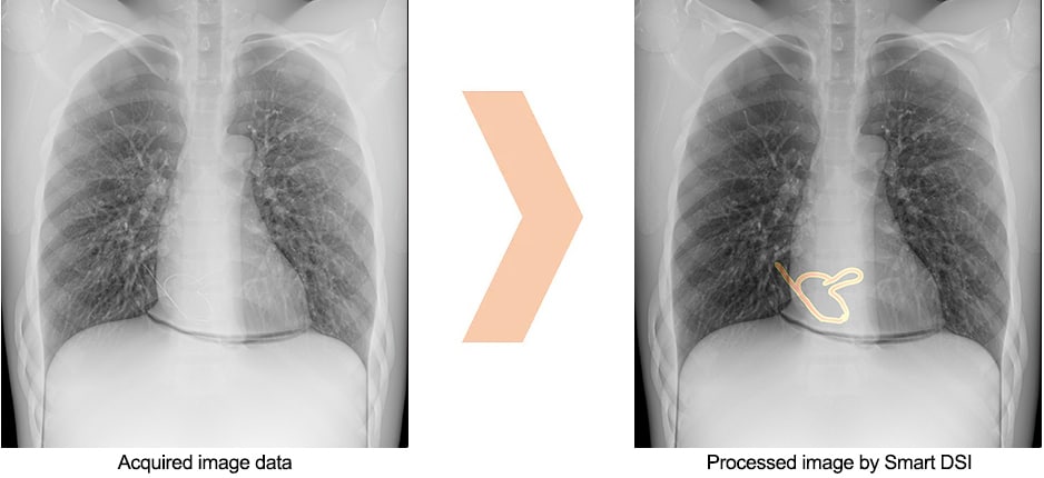 Smart DSI aids the detection of objects retained in the body by enhancing regions of the image that potentially show surgical needles, gauze with radiopaque threads, and other foreign objects.