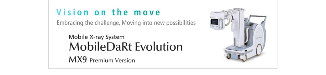 The system is especially useful for imaging in ICUs, where there are numerous devices around the patient. With the long vertical stroke range of X-ray tube and the max. 1200 mm telescopic arm extension, the MX9 is easily positioned for patient imaging.