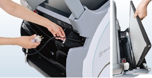 The conveniently accessible power plug is located just under the handlebar on the back side of unit. The FPD can be charged in the main unit via a connector in the FPD bin (option).