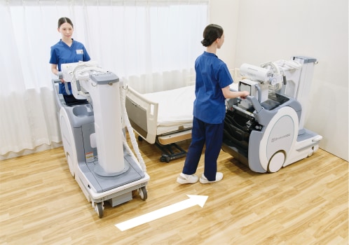 The main unit can be moved forward or backward with switches conveniently located on the collimator. The technologist can adjust positioning more precisely without moving around the patient bed.