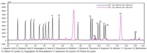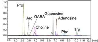 Amino acids are the smallest unit of components for protein synthesis. Many amino acids are known to have a flavor profile, such as glutamic acid, which is known to provide the umami taste. Recently, interest has also focused on the bioactivity of amino acids, which are also ingested as nutrients or functional foods. The chromatogram at the lower right shows an example of pre-column derivatization amino acid analysis using the automatic pre-processing function of the liquid chromatograph autosampler. The work of pre-column derivatization can be automated to save on labor while also enabling high-accuracy measurements.