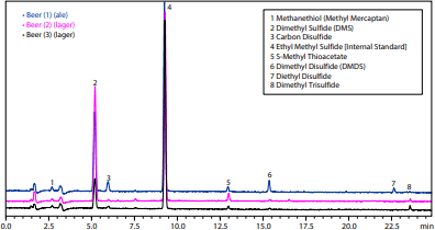 Volatile sulfur compounds are formed in beer during the brewing process and storage, affecting the beer's flavor. They also contribute to off-flavor, which degrades the quality. However, sulfur compounds have a very low threshold value and can impact the quality even at very low concentrations, so pretreatment such as concentration and high sensitivity analysis are required. In this section, we analyze volatile sulfur compounds in three commercially available types of beer using a chemical luminescent sulfur detector (SCD), a detector that is selectable for sulfur compounds, and a headspace sampler. The SCD is the most sensitive type of GC detector for measuring sulfur components. However, it has many units that require control, and complicated procedures are required to prepare it for analysis. The Nexis SCD-2030 has a wealth of automatic functions, making it capable of performing all operations from preparation to analysis with a single click.