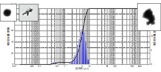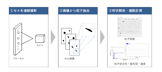 In this method, images of flowing particles are scanned, and the size and shape of each particle are measured using image analysis. The shapes of the particles, which cannot be obtained from the laser diffraction and scattering method, as well as aggregates and trace quantity particles, can be measured using this method.