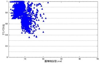 From the particle size distribution, it is clear that the peak is near 5 μm. Also, it is evident from the scatter plot of area-equivalent diameters and aspect ratio that the sample is divided into multiple groups.