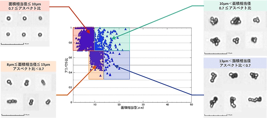 Typical particle images for each region are shown for when the scatter plot is partitioned as shown in the figure below. The larger the particle size, the more yeast cells are connected.