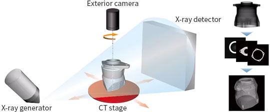 The inspection target (sample) is placed between the X-ray generator and detector, as shown in the figure. Then, the sample is rotated 360 degrees to collect X-ray fluoroscopic data from various angles in order to calculate cross-sectional images.