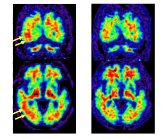 Areas of PET tracer uptake indicated amyloid deposition. Yellow arrows show where PET tracer uptake appeared to extend to the gray matter of the brain (red areas extend to the surface of brain). Based on this, the gray matter was considered positive for amyloid accumulation.