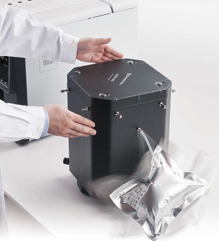 This device is used to introduce gas samples into GC and GC-MS units. Up to 12 sample bags can be installed to save space in the lab. The rotating design of the bag attachment points allows for efficient maintenance and analysis operations. When performing analyses using gas bags, gases containing foreign substances are sometimes analyzed. To prevent contamination, the sampler is designed without any rough surfaces and painted with a special powder coating, thus making long-term use possible.