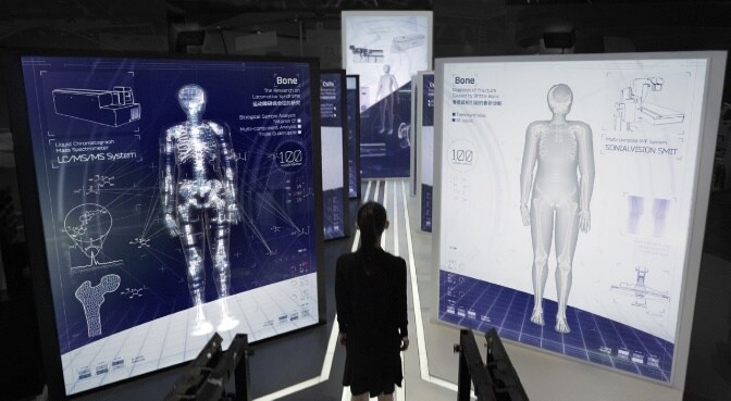 This is an interactive visual experience based on the theme of the fusion of medical and analytical science and technology. The exhibit is a virtual experience where visitors’ bodies are scanned, and X-ray images and component analysis data allow them to visualize the inside of their bodies. Exhibited at the China International Import Expo held in Shanghai in 2020, this innovative display method, which is unique among BtoB companies, attracted a lot of attention from customers!