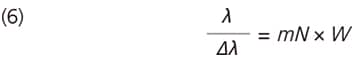 Here, N × W is the total number of grooves in the grating. When the grating is actually used together with other optical elements (e.g., when incorporated in a spectrometer), however, aberrations and imperfections in other elements (e.g., lenses and mirrors) and factors related to the light source or the size of the slits may result in even wider spectral lines. This means that the minimum wavelength difference Δλ that can be resolved will be larger, and, in general, the resolution for the optical system will be lower than that for the gratings only defined by equation (6).