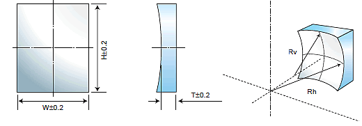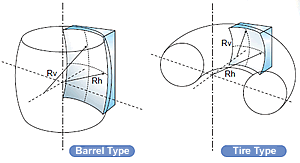 Toroidal mirrors are aspherical mirrors where each curvature of orthogonal two axes (horizontal and vertical one) are different. Barrel or Tire shaped with a rotation axis are available.