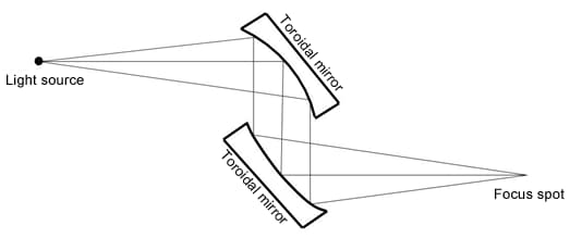 When a spherical mirror focuses a light from a point source, there appears astigmatism. Toroidal mirrors, however, minimize such astigmatism and make it possible to focus on a small spot. The toroidals are ideal for focusing and/or aberration correction devices for spectroscopes.