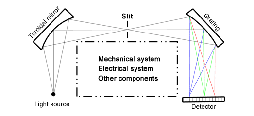 Because of no lens, the toroidal mirrors can focus light of any wavelength without chromatic aberration.