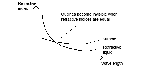 An immersion liquid containing finely ground sample powder is placed on a glass slide and covered with a cover glass. A bright halo is observed around the sample particles when viewed through a microscope with the aperture closed down. These halos are called "Becke lines."