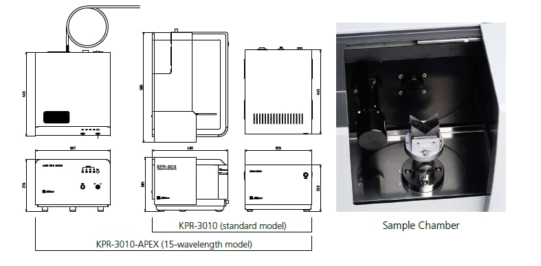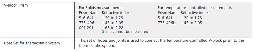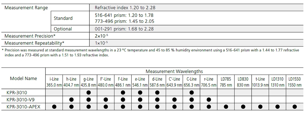 Three models are available, equipped with a light source capable of a standard 5 wavelengths or up to 15 wavelengths depending on the requirements of each application. If an optional temperature-controlled V-block prism is used, temperature dependence information can be obtained for a temperature range from 10 to 70 ℃.
