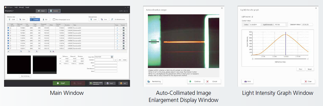 An auto-collimated image is displayed in the software to make adjustments easier during V-block replacement. In addition, because the slit image being measured is displayed together with the light intensity graph, it can be useful for discovering minor differences between samples and abnormalities not indicated by the refractive index. Furthermore, functionality was added for automatically calculating the refractive index of the D-line (589.3 nm). The D-line refractive index is calculated using dispersion equations based on results from measuring 3 standard wavelengths at the d-line, C-line, and F-line. By using an optimal combination of measurement wavelengths and dispersion equations, the results obtained are equivalent to results obtained calculating the refractive index of the D-line based on the refractive index values at sodium lamp brightline wavelengths D1 (589.6 nm) and D2 (589.0 nm).