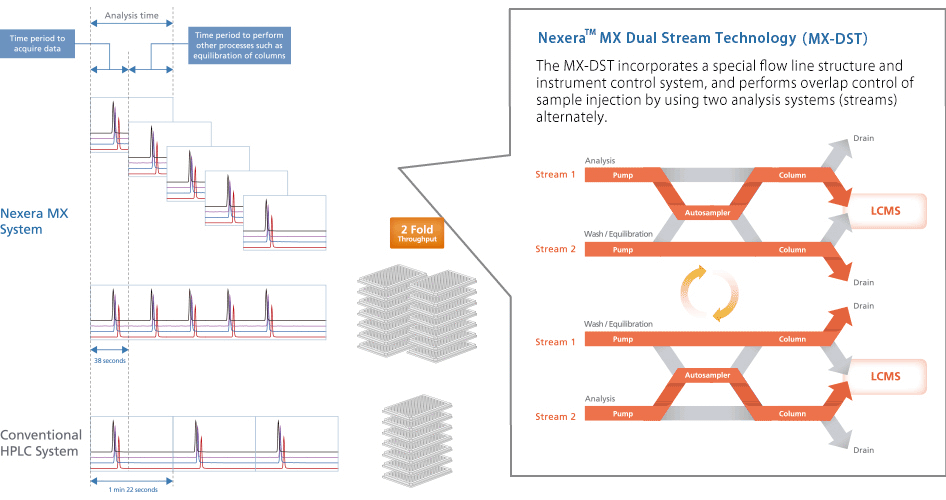 Dual Stream Technology incorporates a special flow line structure and instrument control system, and perform overlap control of sample injection by using two analysis systems(streams) alternately.