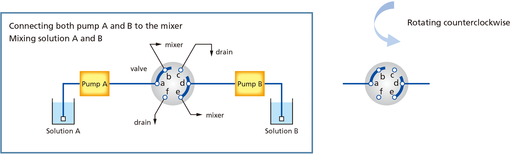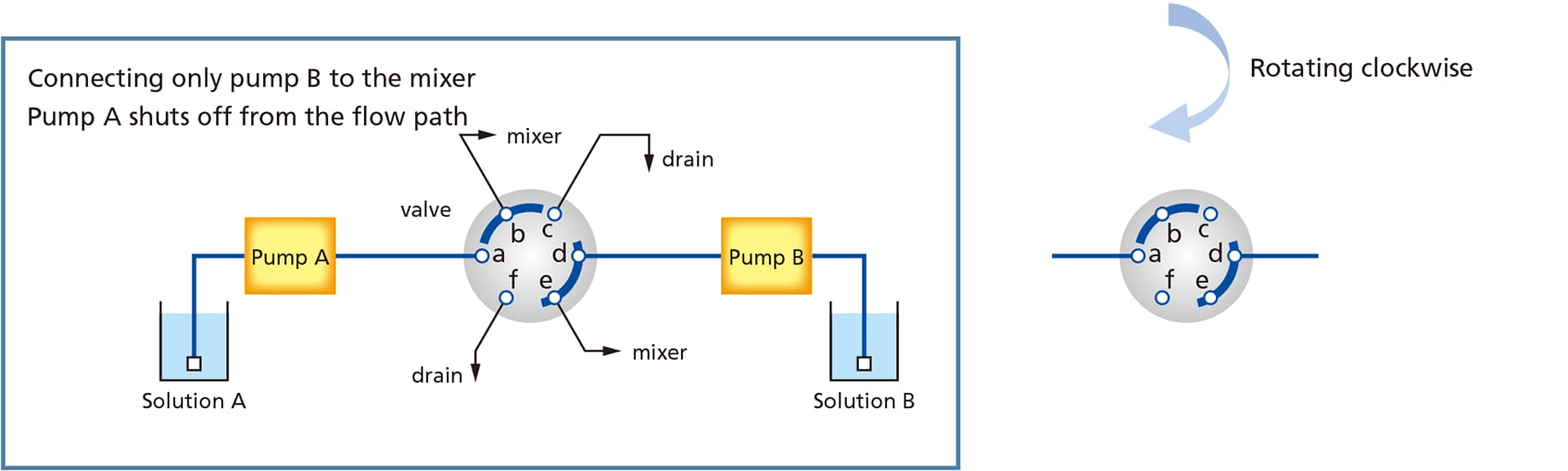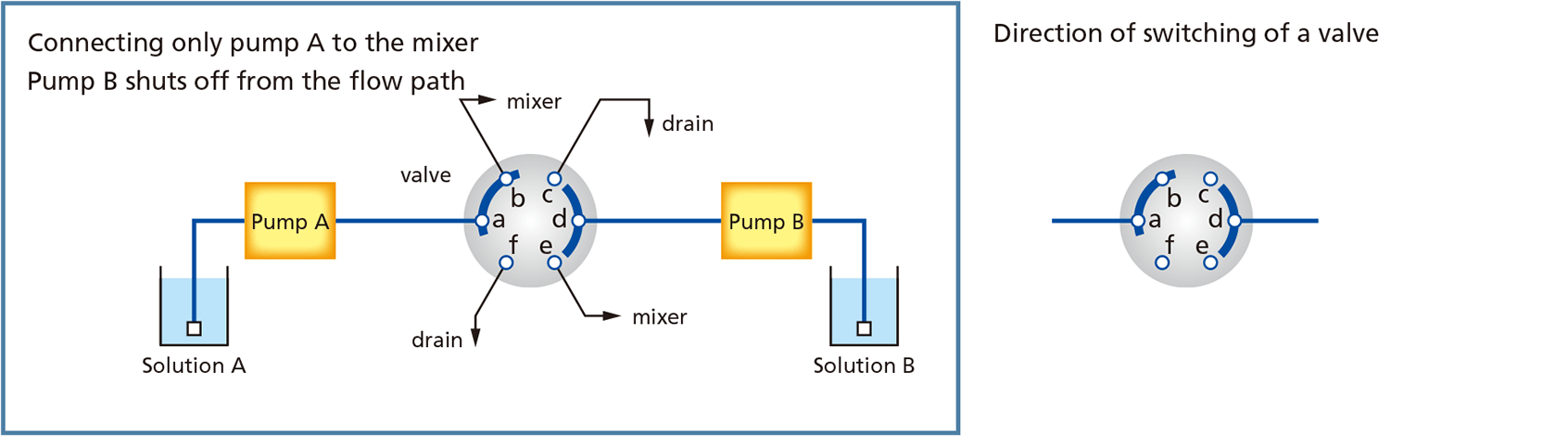 When using LC-Mikros, the valves can be switched into three different states: only pump A is connected to the mixer, only pump B is connected to the mixer, or both pump A and B are connected to the mixer.