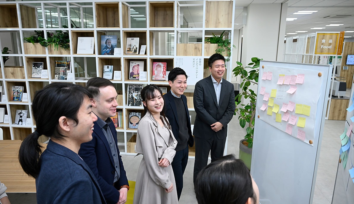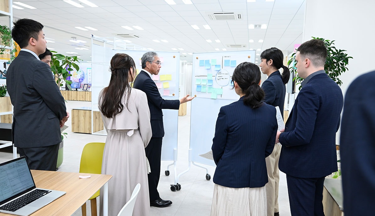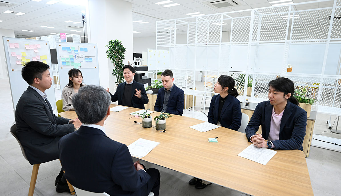 Young employees from different divisions of the company met with President Yamamoto to jointly discuss.