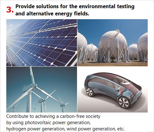 In the environmental testing and alternative energy fields, we will supply products and technologies that help solve the development challenges faced in achieving carbon neutrality. We will reduce our environmental impact throughout the product life cycle by constantly improving energy efficiency and reducing the size of all products.