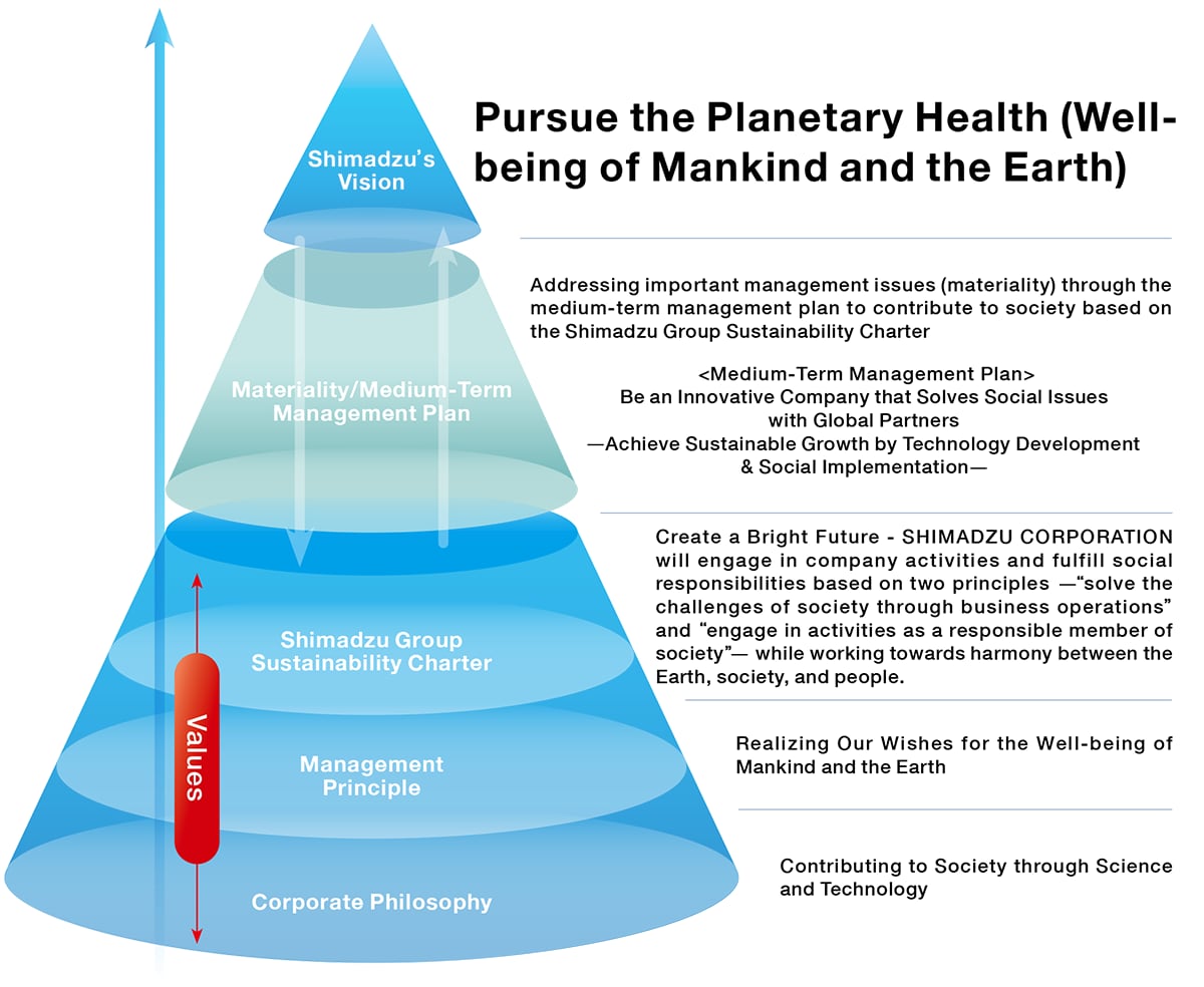 - The main themes of the charter are defined in the Shimadzu Group Sustainability Management Implementation Policy that was based on this Sustainability Charter. Specific KPIs will be set for each theme and used to ensure sustainability is managed in practice.