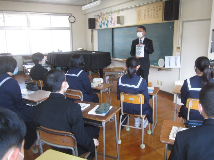 Distributing the Shimadzu Notebooks at the Teshima Junior High School in Tonosho Town