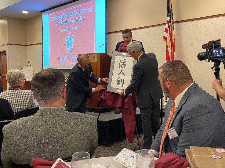 Walsh University President Tim Collins presented a gift to Yoshiaki Maeda, President of SSI