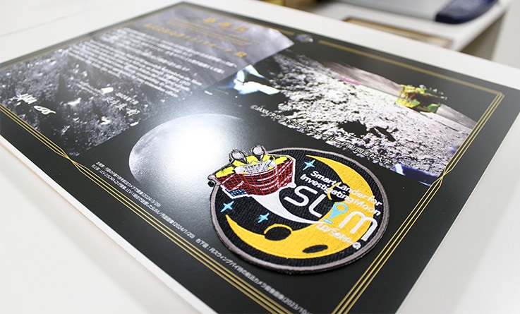 Patch for use only by team members of the SLIM project affixed to the certificate of gratitude from JAXA