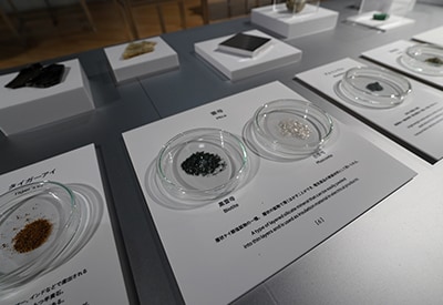 WONDER POWDER is a collaboration with "we+," a design studio that specializes in methods based on research and experimentation. Toshiya Hayashi of we+ notes that "We experimented with about 150 types of powdered materials, and selected patterns in combination with materials that behave beautifully in water. Ultimately 10% of the materials tested were used for the exhibit. Rather than using completely different types of materials, the most beautiful combinations of powders were of the same types, differing only slightly in specific gravity and particle size."