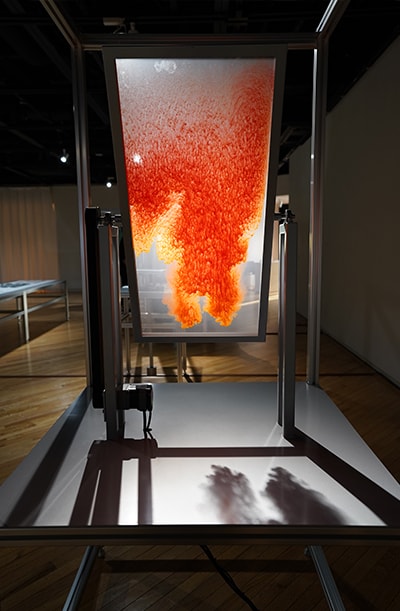 When the author asked whether they had considered using other liquids besides water, Hokuto Ando of we+ replied that "We wanted to emphasize beauty by focusing on identical conditions, the behavior of particles in water." Repeating their experiments while maintaining the same conditions is like what a scientist does, and Ando noted that "Art and science are quite similar."