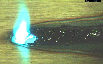 This image of a copper plate irradiated with BLUE IMPACT was taken with a high-speed camera. A molten pool is formed.