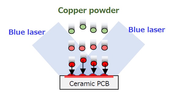 With this technology, bonding is performed by spraying on copper powder while illuminating the aluminum nitride with a laser. Absolutely no brazing filler material is used, which not only simultaneously increases the efficiency and lowers the cost, but also increases the strength of the attachment, improving product quality.