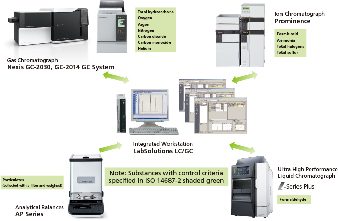 Strict purity standards (ISO 14687-2) are specified for hydrogen used in fuel cells. If the hydrogen contains carbon monoxide or sulfur components, it can break down the catalyst in the fuel cell. Shimadzu analytical instruments are useful for analysis involving in confirming compliance with the many quality control criteria specified in the standard for hydrogen fuel used in fuel cell vehicles (ISO 14687-2). Using LabSolutions LC/GC integrated workstation software enables the control and data analysis for multiple analytical instruments from a single workstation.
